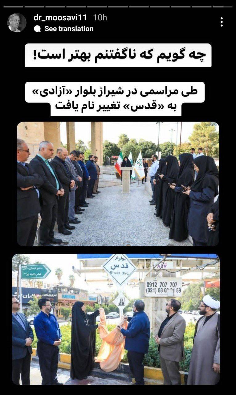 اینکه چرا از میان آن همه خیابان در شیراز، روی “بلوار آزادی” انگشت گذاشتهاند تا آن را به “بلوار قدس” تغییر نام دهند، بیش از آنکه نشانۀ علاقه به قدس باشد، اعلام نفرت و بیزاری از آزادی است!