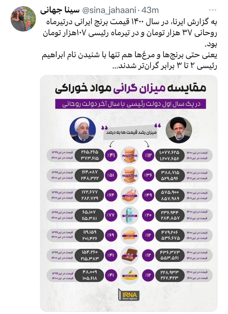 سینا جهانی، خبرنگار:به گزارش ایرنا، در سال ۱۴۰۰ قیمت برنج ایرانی در تیرماه روحانی ۳۷ هزار تومان و در تیرماه رئیسی ۱۰۷هزار تومان بود. یعنی حتی برنجها و مرغها هم تنها با شنیدن نام ابراهیم رئیسی ۲ تا ۳ برابر گرانتر شدند!! این پست دارای یک دیدگاه است فرزاد پاسخ 1 شهریور 1402 گیر عجب دزدهایی افتادیم ……. یکی از یکی دزد تر .. خجالت هم خوب چیزیه .. مگه مردم چه گناهی کردند که گیر همیچین ملایانی افتادن ؟ دیدگاهتان را بنویسید لغو پاسخدیدگاهبرای ارسال دیدگاه نام یا نامکاربری خود را وارد کنید برای ارسال دیدگاه آدرس ایمیل خود را وارد کنید آدرس وبسایت خود را وارد کنید (اختیاری) ذخیره نام، ایمیل و وبسایت من در مرورگر برای زمانی که دوباره دیدگاهی مینویسم. Δ