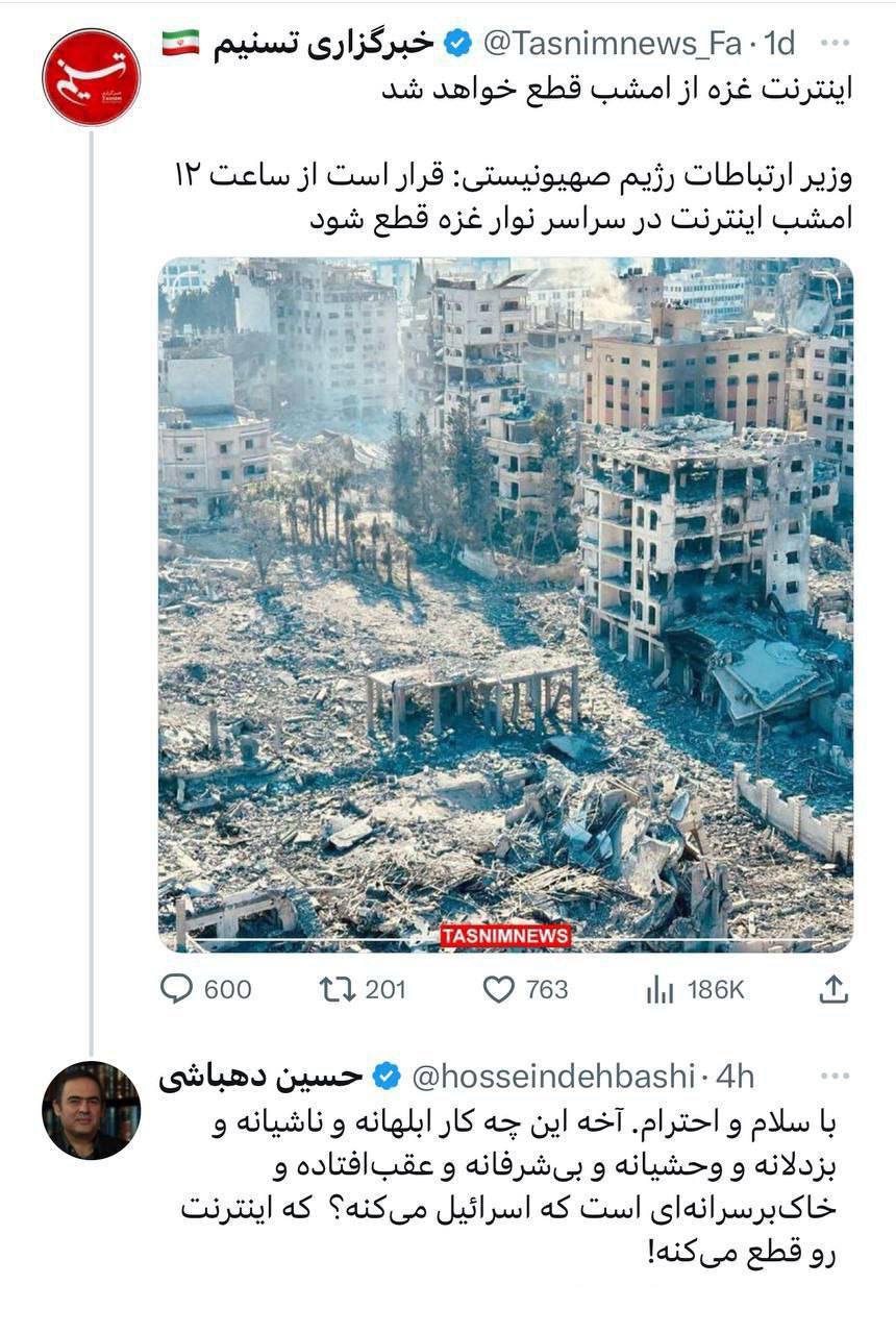 «آخه این چه کار ابلهانه و ناشیانه و بزدلانه و وحشیانه و بیشرفانه و عقبافتاده و خاکبرسرانهای است که اسرائیل میکنه؟ که اینترنت رو قطع میکنه!» دیدگاهتان را بنویسید لغو پاسخدیدگاهبرای ارسال دیدگاه نام یا نامکاربری خود را وارد کنید برای ارسال دیدگاه آدرس ایمیل خود را وارد کنید آدرس وبسایت خود را وارد کنید (اختیاری) ذخیره نام، ایمیل و وبسایت من در مرورگر برای زمانی که دوباره دیدگاهی مینویسم. Δ