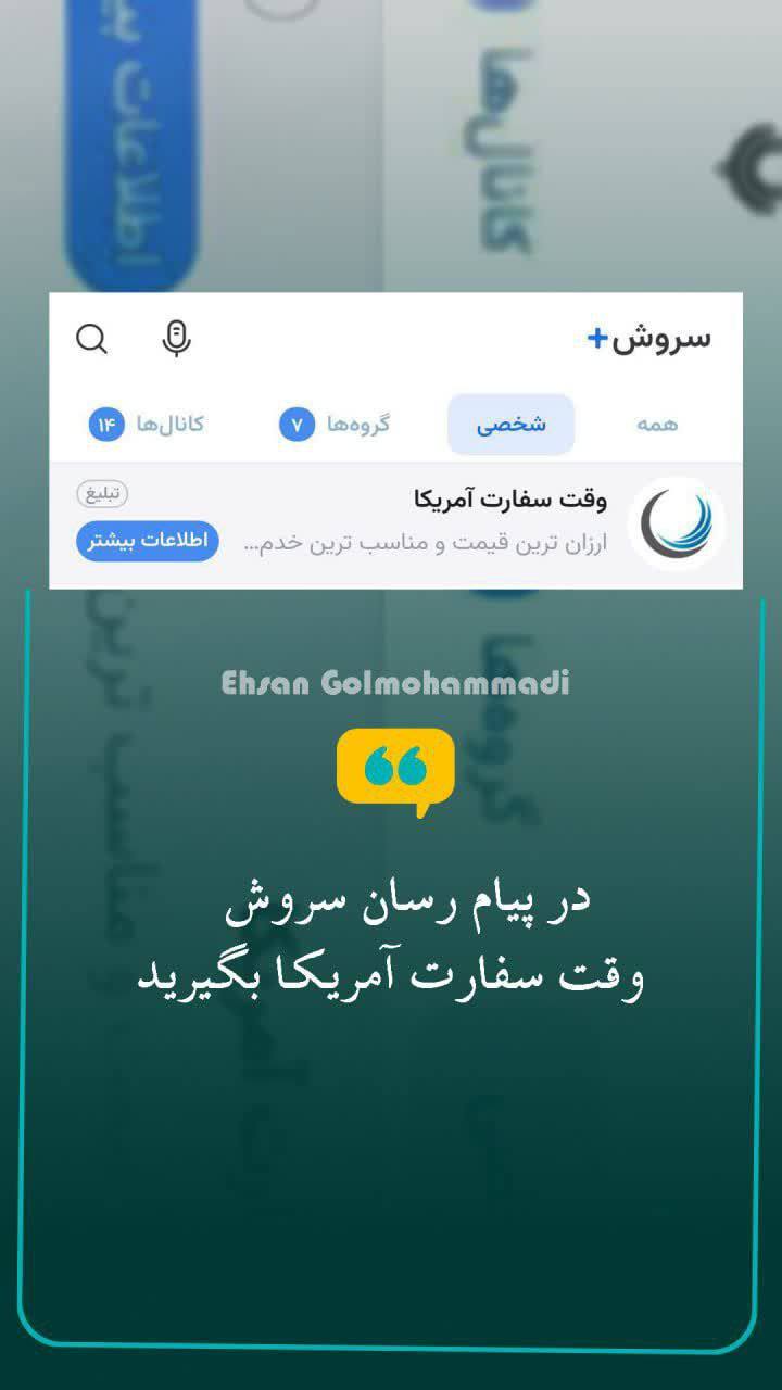 ✍ احسان گل محمدی فعال رسانه ای با اشتراک گذاشتن تصویری از آگهی وقت سفارت آمریکا در پیام رسان ایرانی سروش، نوشته: