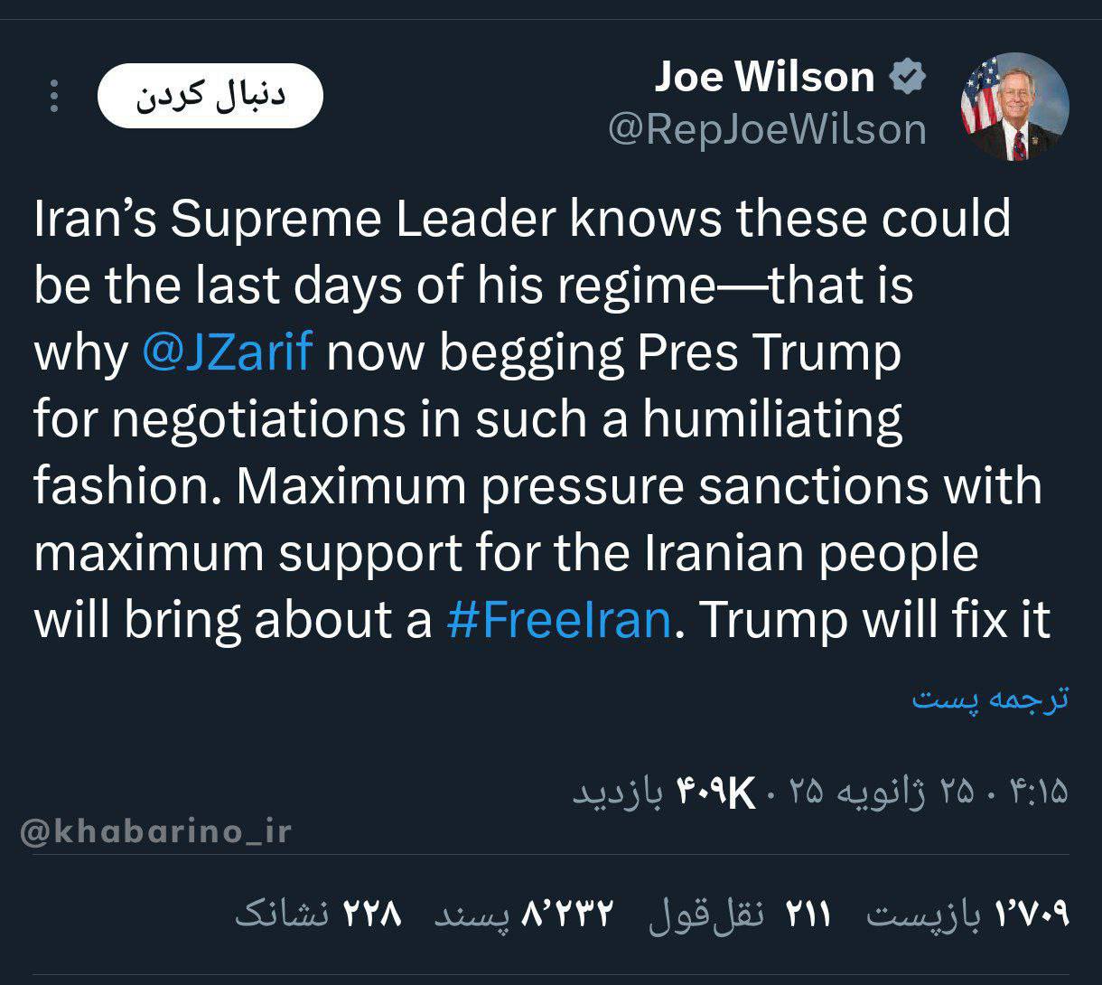 🔺رهبر ایران میداند که این میتواند آخرین روزهای رژیم او باشد.به همین دلیل است که ظریف اکنون به شکلی تحقیرآمیز از رئیس جمهور ترامپ برای مذاکره التماس میکند دیدگاهتان را بنویسید لغو پاسخدیدگاهبرای ارسال دیدگاه نام یا نامکاربری خود را وارد کنید برای ارسال دیدگاه آدرس ایمیل خود را وارد کنید آدرس وبسایت خود را وارد کنید (اختیاری) ذخیره نام، ایمیل و وبسایت من در مرورگر برای زمانی که دوباره دیدگاهی مینویسم. Δ