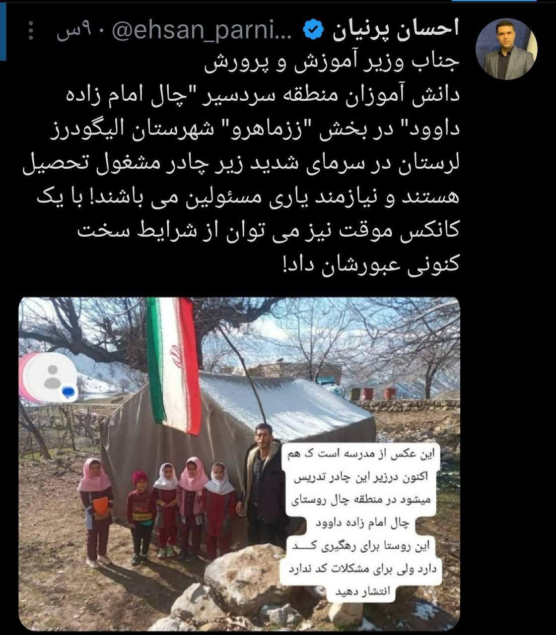 دانش آموزان منطقه سردسیر “چال امام زاده داوود” در بخش “ززماهرو” شهرستان الیگودرز لرستان در سرمای شدید زیر چادر مشغول تحصیل هستند و نیازمند یاری مسئولین می باشند! با یک کانکس موقت نیز می توان از شرایط سخت کنونی عبورشان داد!