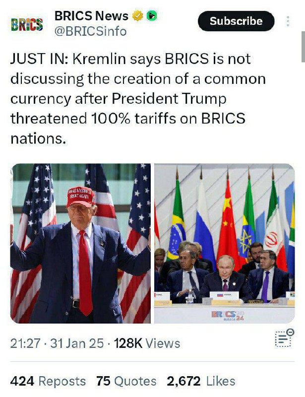 🔸️کرملین اعلام کرد گروه بریکس برنامه ای برای ایجاد واحد پول جدید ندارد. 🔸️ترامپ تهدید کرده بود در صورتی که بریکس دلار را جایگزین کند تعرفه ۱۰۰ درصدی بر آنها اعمال خواهد کرد. دیدگاهتان را بنویسید لغو پاسخدیدگاهبرای ارسال دیدگاه نام یا نامکاربری خود را وارد کنید برای ارسال دیدگاه آدرس ایمیل خود را وارد کنید آدرس وبسایت خود را وارد کنید (اختیاری) ذخیره نام، ایمیل و وبسایت من در مرورگر برای زمانی که دوباره دیدگاهی مینویسم. Δ