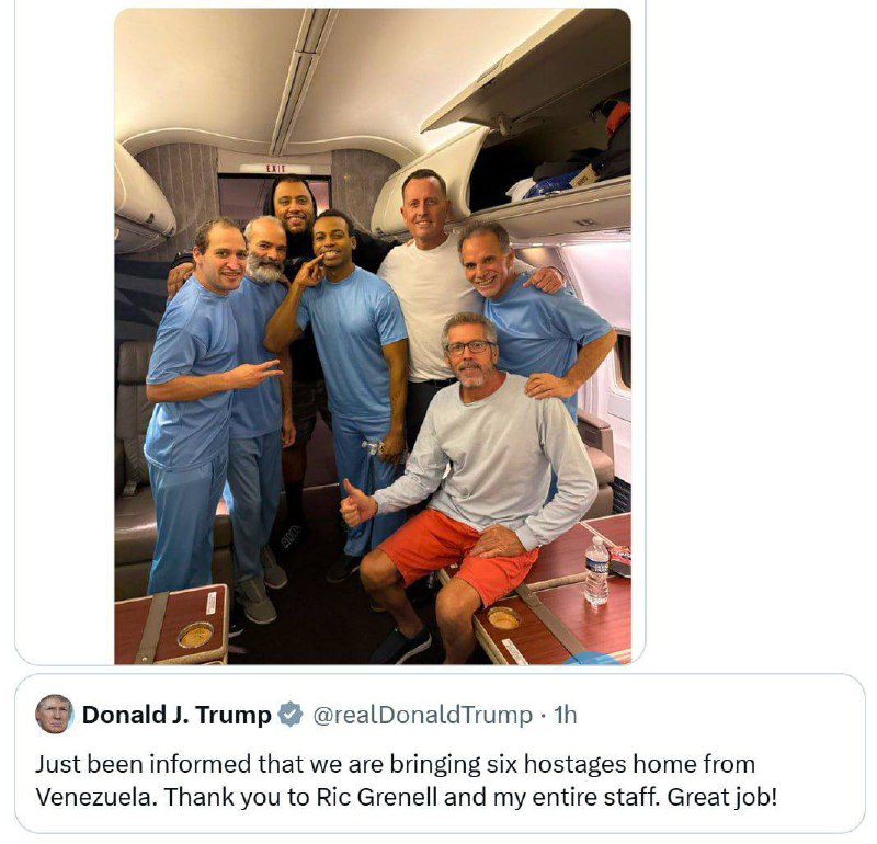 🔸آقای ترامپ در شبکههای اجتماعی نوشت: «هماکنون مطلع شدم که شش گروگان را از ونزوئلا به خانه میآوریم.»