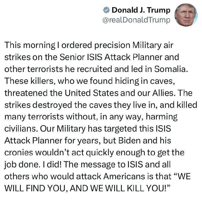 دستور حملات هوایی دقیق نظامی به طراح ارشد حملات داعش و سایر تروریست هایی که در سومالی جذب و رهبری می کرد را صادر کردم.