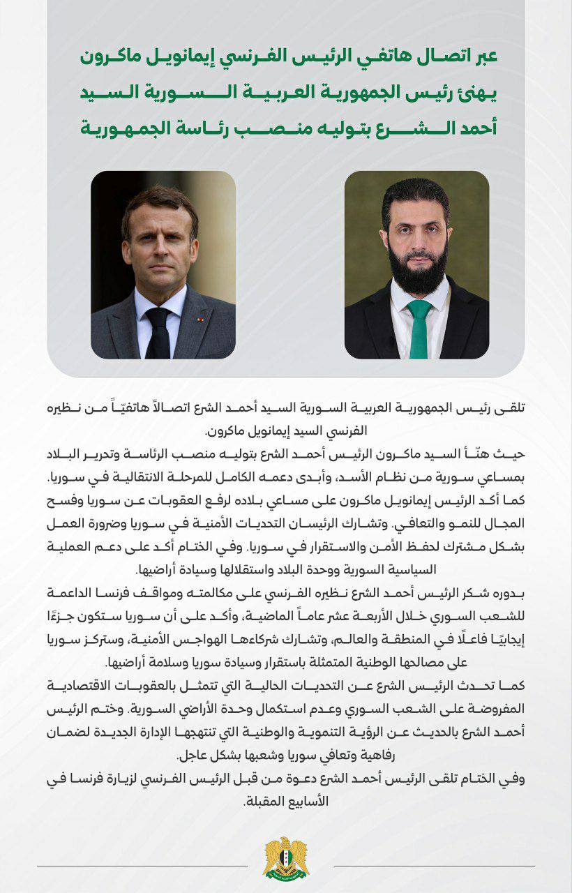 🔸️ماکرون رئیس جمهور فرانسه طی تماس تلفنی به احمد الشرع ریاست جمهوری او را تبریک گفت. 🔸️همچنین ماکرون از الشرع برای سفر به فرانسه دعوت کرد. دیدگاهتان را بنویسید لغو پاسخدیدگاهبرای ارسال دیدگاه نام یا نامکاربری خود را وارد کنید برای ارسال دیدگاه آدرس ایمیل خود را وارد کنید آدرس وبسایت خود را وارد کنید (اختیاری) ذخیره نام، ایمیل و وبسایت من در مرورگر برای زمانی که دوباره دیدگاهی مینویسم. Δ