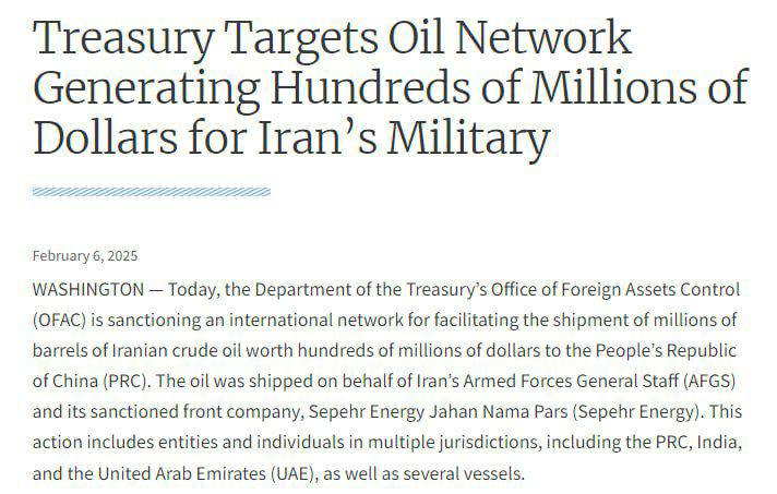🔸️به گفته وزارت خزانهداری آمریکا، این تحریم نهادها و افرادی را در چند کشور از جمله چین، هند، امارات متحده عربی و همچنین چند کشتی را هدف قرار میدهد.
