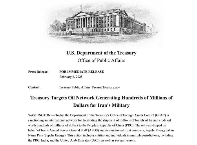 وزارت خزانهداری ایالات متحده آمریکا حریمهایی را علیه شبکهای بینالمللی اعمال کرد که به انتقال میلیونها بشکه نفت خام ایران به چین متهم است. این شبکه، که شامل افراد و شرکتهایی از چین، هند و امارات متحده عربی میشود، به تأمین مالی فعالیتهای نظامی و برنامههای هستهای رژیم ایران کمک کرده است.