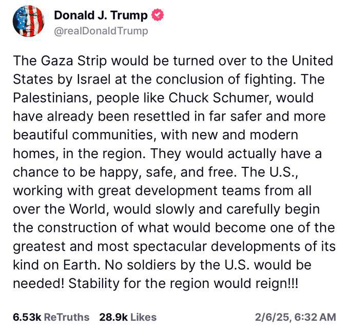 نوار غزه پس از پایان جنگ توسط اسرائیل به ایالات متحده تحویل داده خواهد شد. فلسطینیها، از جمله افرادی مانند چاک شومر، پیش از این در جوامع امنتر و زیباتر با خانههای جدید و مدرن در منطقه اسکان داده شدهاند. آنها فرصت خواهند داشت تا در محیطی شاد، ایمن و آزاد زندگی کنند. ایالات متحده، در همکاری با تیمهای بزرگ توسعه از سراسر جهان، به آرامی و با دقت شروع به ساخت یکی از بزرگترین و دیدنیترین پیشرفتها در نوع خود در جهان خواهد کرد. هیچ نیروی نظامی از ایالات متحده مورد نیاز نخواهد بود! ثبات در منطقه برقرار خواهد شد!!!