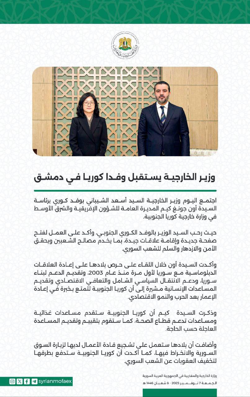 🔸اسعد الشیبانی، وزیر امور خارجه سوریه، با هیئتی از کره جنوبی دیدار و بر تلاش برای گشودن صفحهای جدید و برقراری روابطی دو جانبه بر اساس خدمت به منافع دو کشور تاکید کرد.