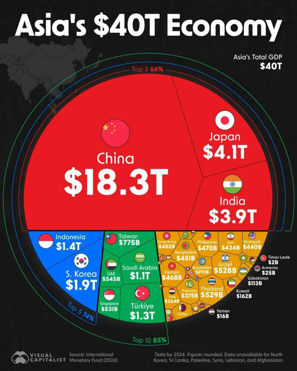 🔸اقتصاد آسیا در 2024 بالغ بر 40 تریلیون دلار است. سه کشور چین، ژاپن و هند 66 درصد اقتصاد را در اختیار دارند. با اضافه شدن کرهجنوبی و اندونزی سهم پنج اقتصاد برتر به 74 درصد میرسد.