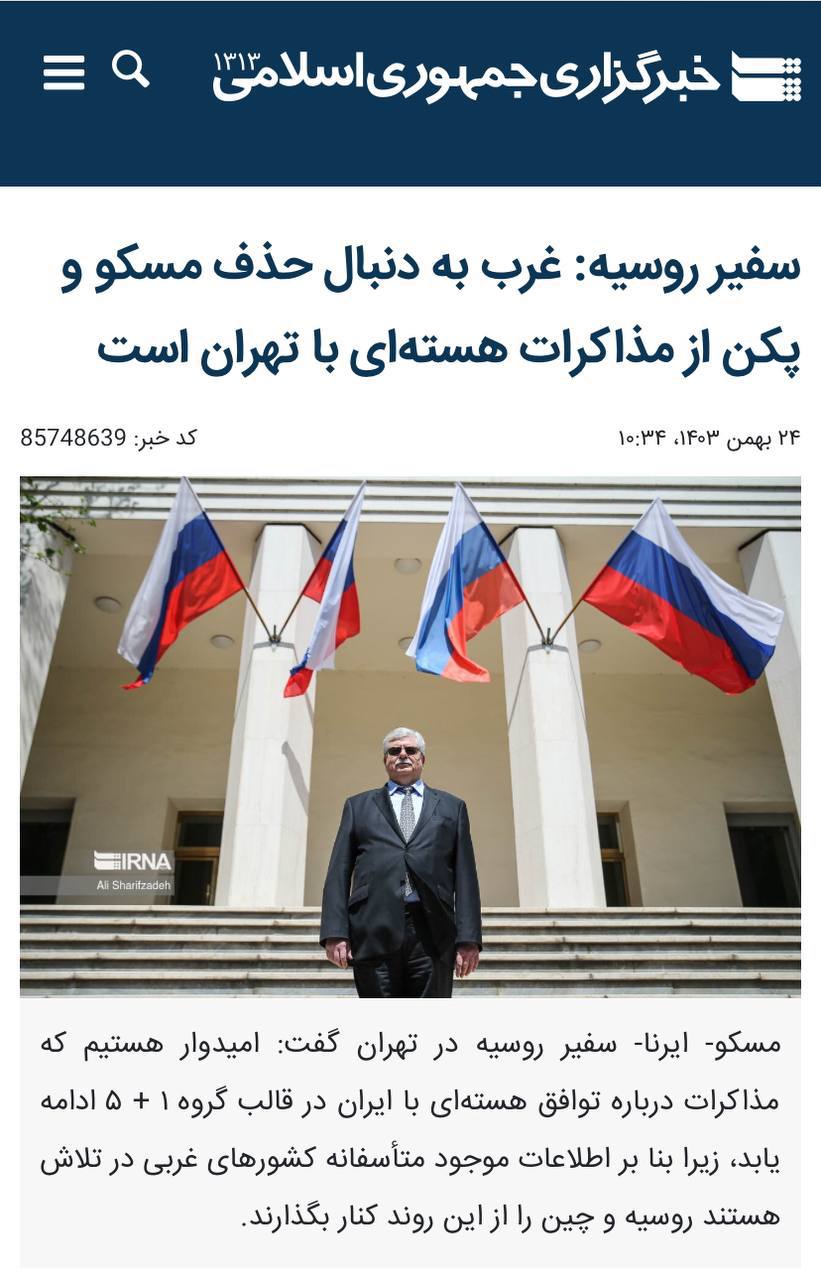 سفیر روسیه در تهران به ریانووستی: ⏺روسیه و چین باید در مذاکرات برای احیای برجام حضور داشته باشند ⏺بدون مسکو و پکن، مذاکرات به نتیجه نمیرسد ⏺ما طرفدار این هستیم که قالب 1+5 توسط غرب از یک سو و ایران از سوی دیگر حفظ شود. دیدگاهتان را بنویسید لغو پاسخدیدگاهبرای ارسال دیدگاه نام یا نامکاربری خود را وارد کنید برای ارسال دیدگاه آدرس ایمیل خود را وارد کنید آدرس وبسایت خود را وارد کنید (اختیاری) ذخیره نام، ایمیل و وبسایت من در مرورگر برای زمانی که دوباره دیدگاهی مینویسم. Δ