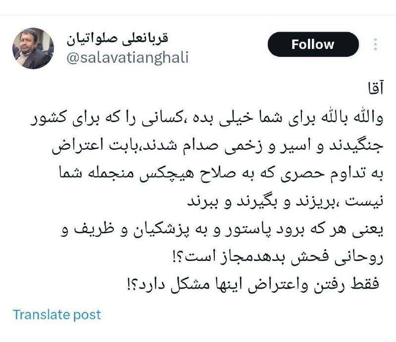 آقا والله بالله برای شما خیلی بده، کسانی را که برای کشور جنگیدند و اسیر و زخمی صدام شدند، بابت اعتراض به تداوم حصری که به صلاح هیچکس منجمله شما نیست، بریزند و بگیرند و ببرند