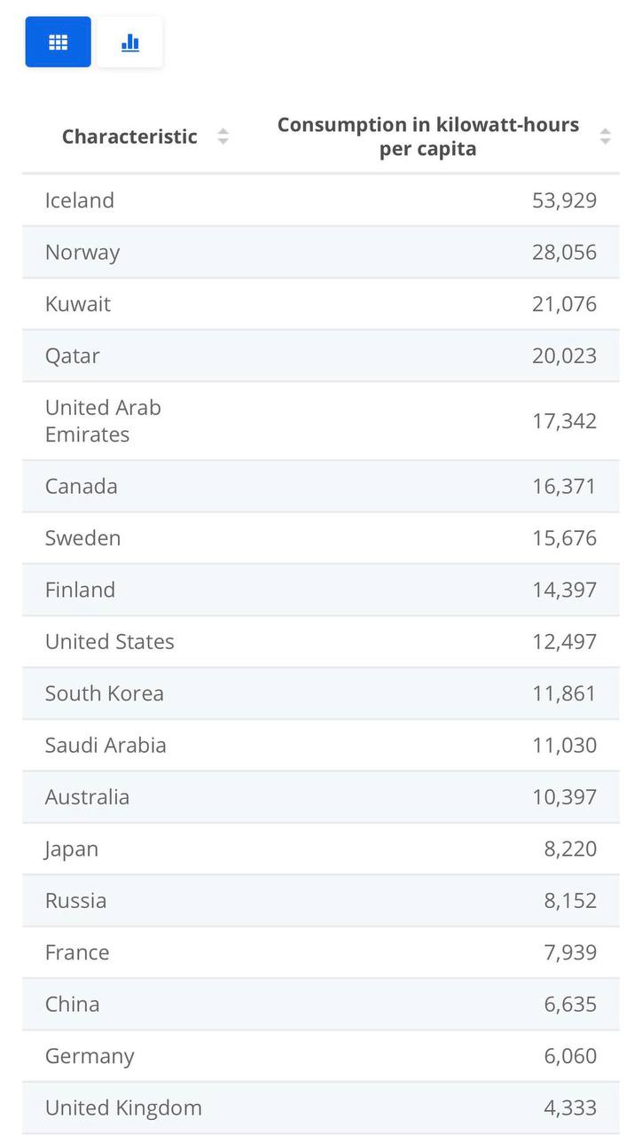 اون بالاها رو کار ندارم، ولی اون پایین بریتانیا رو ببنید، مصرف سرانهاش ۴۳۳۳ kWh.