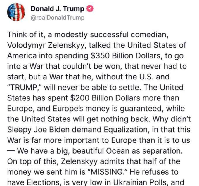 به این فکر کنید، یک کمدین نسبتاً موفق، ولودیمیر زلنسکی، از ایالات متحده آمریکا میخواهد که 350 میلیارد دلار خرج کند، تا وارد جنگی شود که نمیتواند در آن پیروز شود، جنگی که نباید هرگز شروع میشد، جنگی که او، بدون ایالات متحده و”ترامپ” هرگز قادر به حل و فصل آن نخواهد بود.