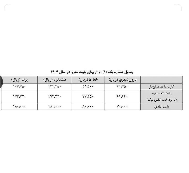 نرخ بلیت مترو در سال ۱۴۰۴ نسبت به سال ۱۴۰۳ به میزان ۲۵ درصد افزایش قیمت خواهد داشت.