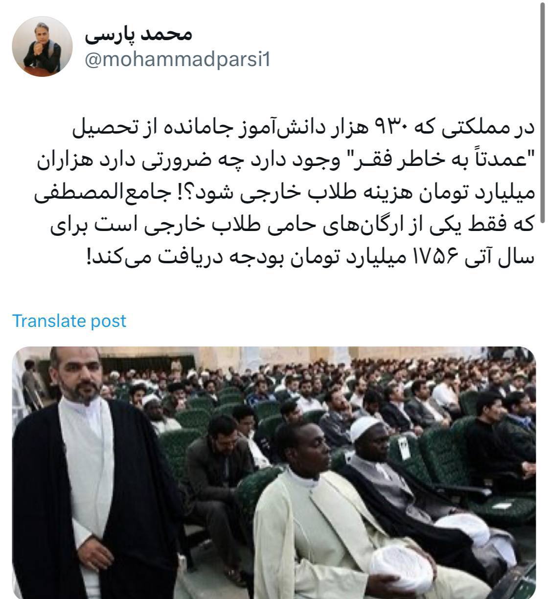 ✍️ محمد پارسی: در مملکتی که ۹۳۰ هزار دانشآموز جامانده از تحصیل “عمدتاً به خاطر فقـر” وجود دارد چه ضرورتی دارد هزاران میلیارد تومان هزینه طلاب خارجی شود؟! جامعالمصطفی که فقط یکی از ارگانهای حامی طلاب خارجی است برای سال آتی ١۷۵۶ میلیارد تومان بودجه دریافت میکند!