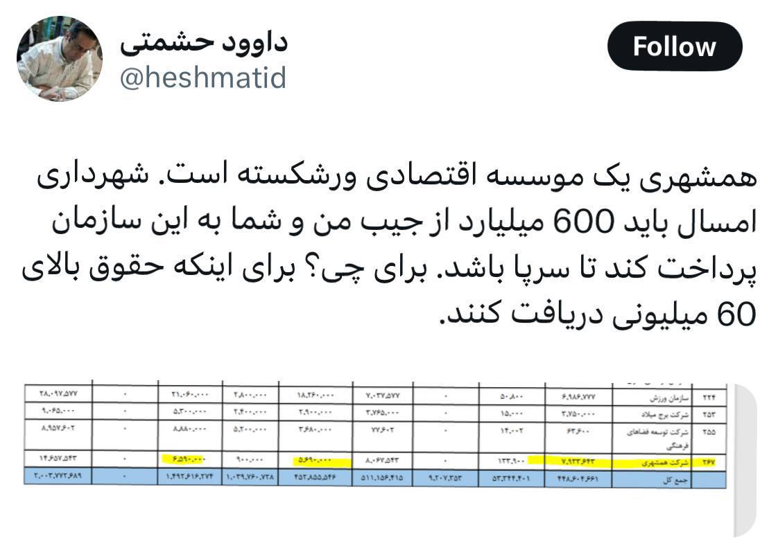 ✍️داود حشمتی: . شهرداری امسال باید 600 میلیارد از جیب من و شما به این سازمان پرداخت کند تا سرپا باشد. برای چی؟ برای اینکه حقوق بالای 60 میلیونی دریافت کنند. دیدگاهتان را بنویسید لغو پاسخدیدگاهبرای ارسال دیدگاه نام یا نامکاربری خود را وارد کنید برای ارسال دیدگاه آدرس ایمیل خود را وارد کنید آدرس وبسایت خود را وارد کنید (اختیاری) ذخیره نام، ایمیل و وبسایت من در مرورگر برای زمانی که دوباره دیدگاهی مینویسم. Δ