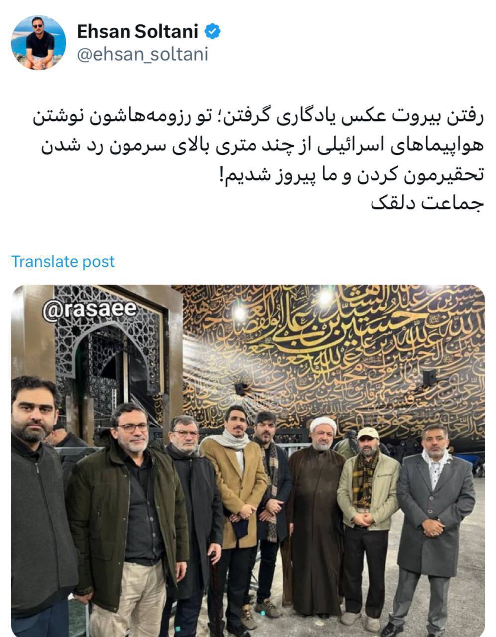 رفتن بیروت عکس یادگاری گرفتن؛ تو رزومههاشون نوشتن هواپیماهای اسرائیلی از چند متری بالای سرمون رد شدن تحقیرمون کردن و ما پیروز شدیم! جماعت دلقک/ احسان سلطانی دیدگاهتان را بنویسید لغو پاسخدیدگاهبرای ارسال دیدگاه نام یا نامکاربری خود را وارد کنید برای ارسال دیدگاه آدرس ایمیل خود را وارد کنید آدرس وبسایت خود را وارد کنید (اختیاری) ذخیره نام، ایمیل و وبسایت من در مرورگر برای زمانی که دوباره دیدگاهی مینویسم. Δ