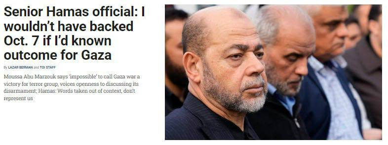 🔸موسی ابومرزوق، از رهبران کنه کار و محبوب حماس گفت: اگر میدانستم که این حمله به غزه چه میزان ویرانی خواهد داشت، از حمله ۷ اکتبر ۲۰۲۳ به اسرائیل حمایت نمیکردم.