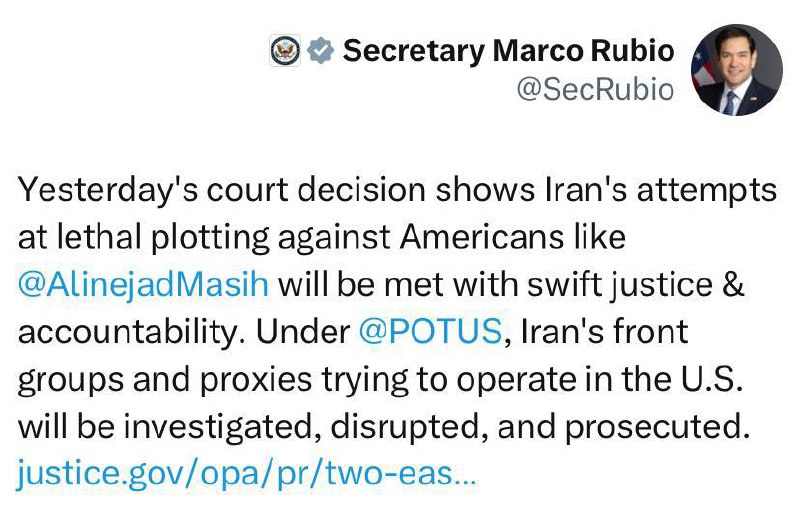 تصمیم دادگاه دیروز نشان داد که تلاشهای ایران برای توطئه مرگبار علیه آمریکاییها مانند مسیح علینژاد با عدالت و پاسخگویی سریع مواجه خواهد شد. در ریاست جمهوری ترامپ گروهها و نیابتیهای ایران که تلاش میکنند در ایالات متحده فعالیت کنند، مورد بازرسی، اختلال و پیگرد قانونی قرار خواهند گرفت.