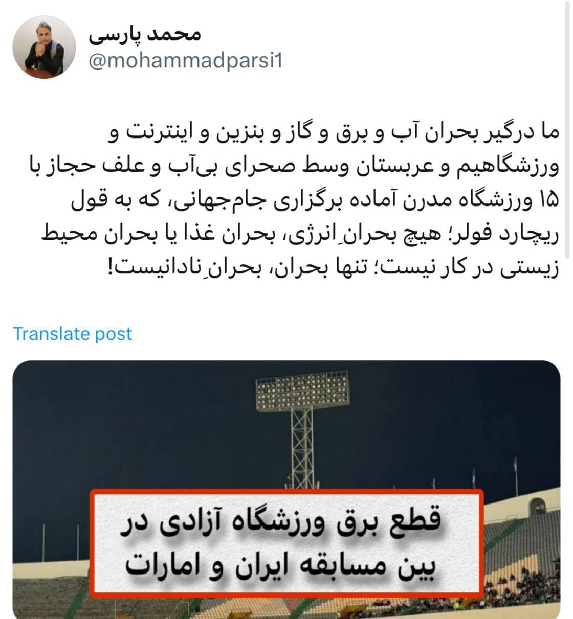 ما درگیر بحران آب و برق و گاز و بنزین و اینترنت و ورزشگاهیم و عربستان وسط صحرای بیآب و علف حجاز با ۱۵ ورزشگاه مدرن آماده برگزاری جامجهانی، که به قول ریچارد فولر؛ هیچ بحرانِ انرژی، بحران غذا یا بحران محیط زیستی در کار نیست؛ تنها بحران، بحرانِ نادانیست!