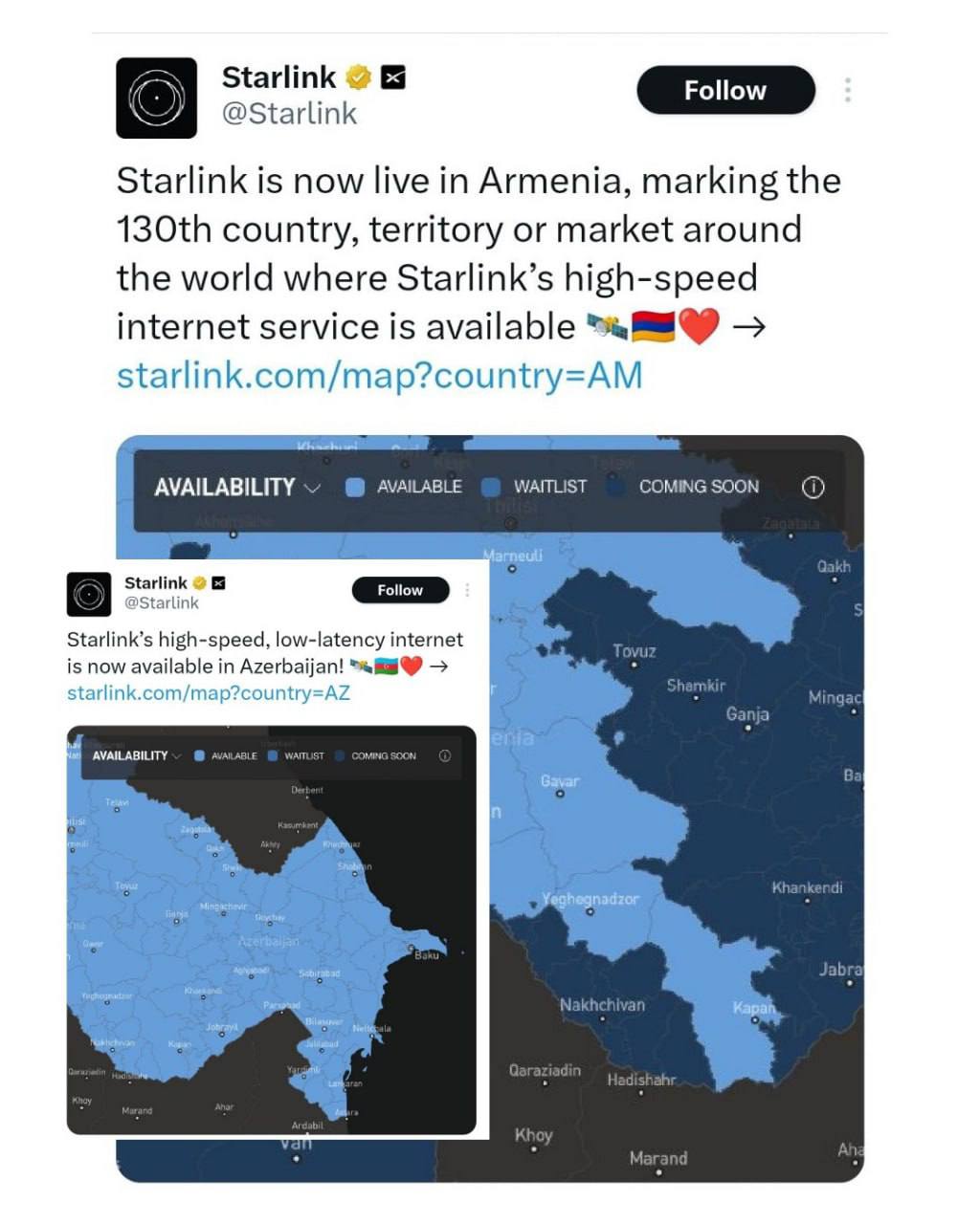 حساب رسمی استارلینک در شبکه اجتماعی ایکس اعلام کرد که اینترنت ماهوارهای اسپیسایکس اکنون در کشورهای آذربایجان و ارمنستان در دسترس است.