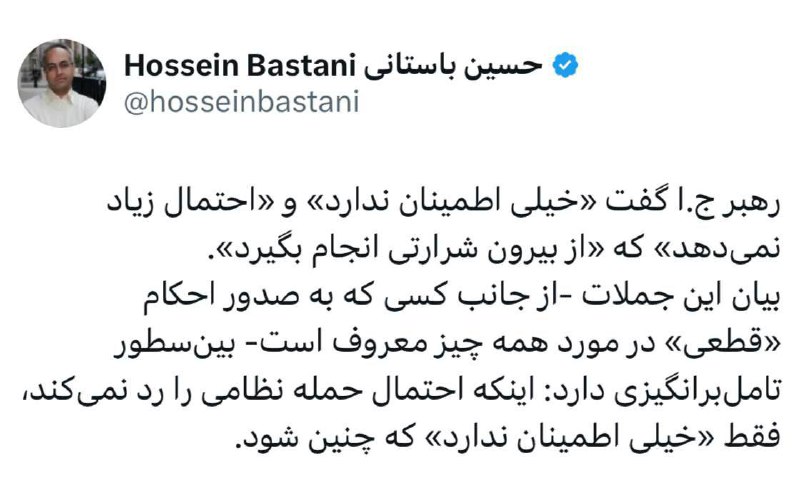 حسین باستانی: رهبر ج.ا گفت «خیلی اطمینان ندارد» و «احتمال زیاد نمیدهد» که «از بیرون شرارتی انجام بگیرد».