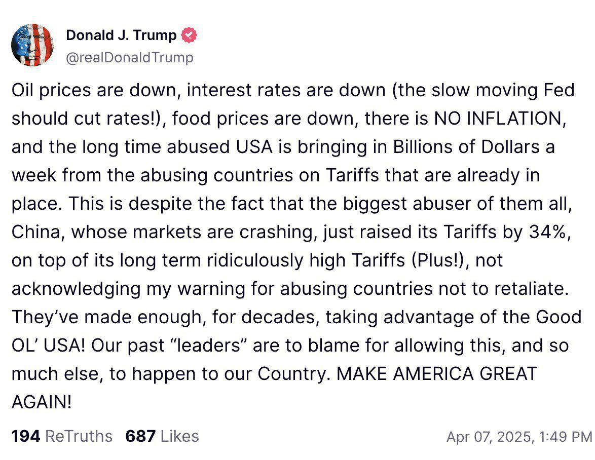 🔸️«قیمت نفت پایین آمده، نرخ بهره کاهش یافته (بانک مرکزی تنبل فدرال باید نرخها را بیشتر کاهش دهد!)، قیمت مواد غذایی هم کاهش داشته، و هیچ تورمی وجود ندارد. آمریکا که سالها مورد سوءاستفاده قرار گرفته بود، حالا هر هفته میلیاردها دلار از کشورهایی که ما را استثمار کردهاند، از محل تعرفههایی که پیشتر وضع شده، به دست میآورد.»