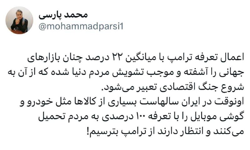 اونوقت در ایران سالهاست بسیاری از کالاها مثل خودرو و گوشی موبایل را با تعرفه ۱۰۰ درصدی به مردم تحمیل میکنند و انتظار دارند از ترامپ بترسیم! دیدگاهتان را بنویسید لغو پاسخدیدگاهبرای ارسال دیدگاه نام یا نامکاربری خود را وارد کنید برای ارسال دیدگاه آدرس ایمیل خود را وارد کنید آدرس وبسایت خود را وارد کنید (اختیاری) ذخیره نام، ایمیل و وبسایت من در مرورگر برای زمانی که دوباره دیدگاهی مینویسم. Δ