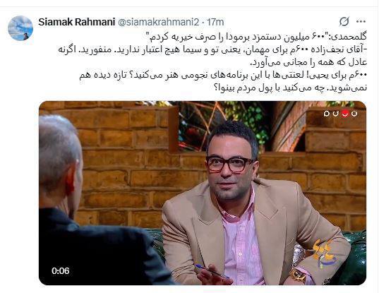 سیامک رحمانی ، فعال رسانه در خصوص پرداخت هدیه 600 میلیون تومانی برای میهمان های برنامه های صدا و سیما نوشت: گلمحمدی:”۶۰۰ میلیون دستمزد برمودا را صرف خیریه کردم.”