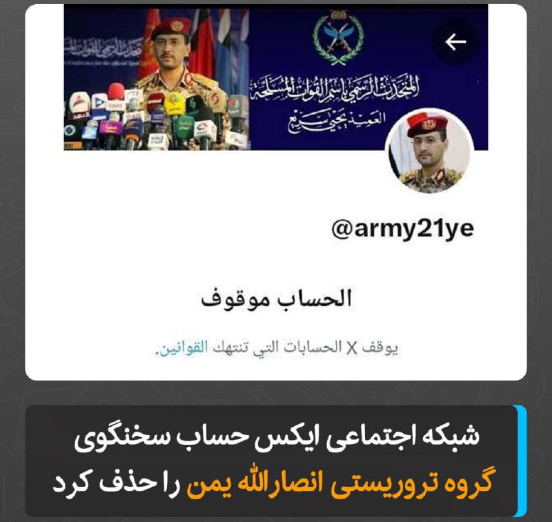 شبکه اجتماعی «ایکس» حساب کاربری یحیی سریع، سخنگوی گروه تروریستی انصارالله یمن را که بیش از یک میلیون دنبالکننده داشت، حذف کرد.