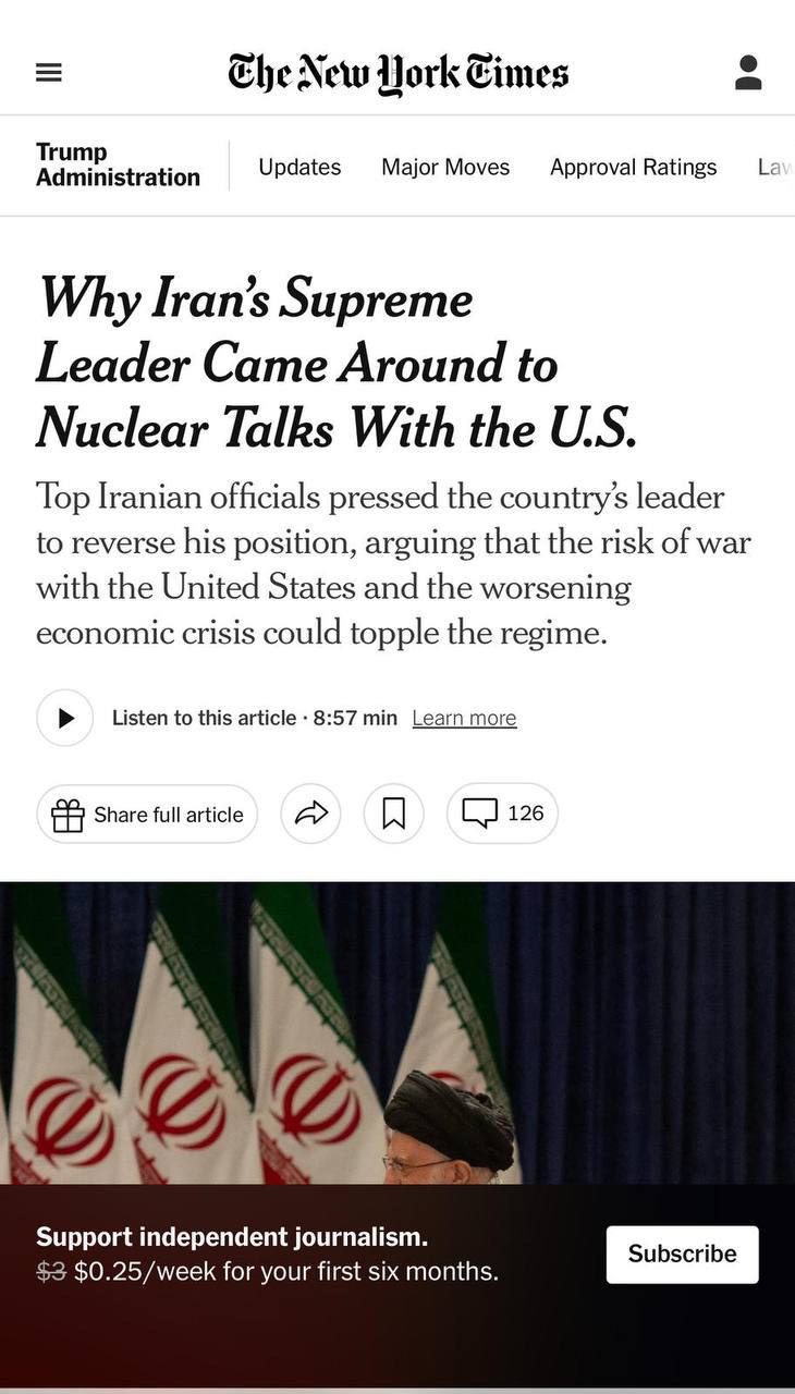 روزنامه نیویورکتایمز در گزارشی با اشاره به چرخش موضع خامنه ای نسبت به مذاکرات هستهای با آمریکا نوشت: مقامات ارشد ایرانی با هشدار نسبت به خطر جنگ با ایالات متحده و همچنین تشدید بحران اقتصادی، خامنهای را تحت فشار قرار دادند تا موضع خود را تغییر دهد.