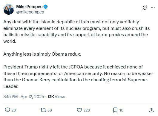 🔸️«هرگونه توافقی با جمهوری اسلامی ایران، نهتنها باید بهصورت قابل راستیآزمایی، تمامی اجزای برنامه هستهای این کشور را از میان بردارد، بلکه باید توانمندی موشکی بالستیک آن و همچنین حمایت از گروههای نیابتی تروریستی ایران در سراسر جهان را نیز نابود سازد. هر چیز کمتر از این، چیزی جز تکرار دوران اوباما نیست.»