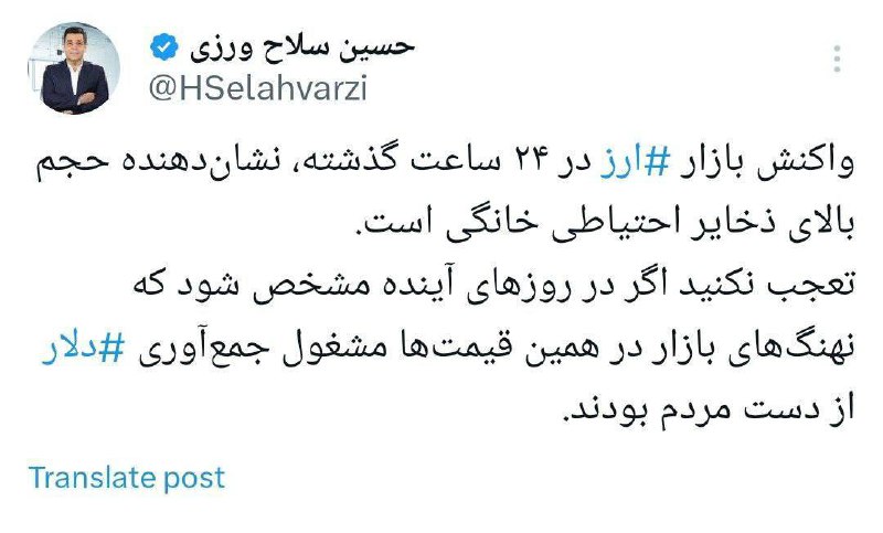 واکنش بازار ارز در ۲۴ ساعت گذشته، نشاندهنده حجم بالای ذخایر احتیاطی خانگی است. تعجب نکنید اگر در روزهای آینده مشخص شود که نهنگهای بازار در همین قیمتها مشغول جمعآوری دلار از دست مردم بودند. دیدگاهتان را بنویسید لغو پاسخدیدگاهبرای ارسال دیدگاه نام یا نامکاربری خود را وارد کنید برای ارسال دیدگاه آدرس ایمیل خود را وارد کنید آدرس وبسایت خود را وارد کنید (اختیاری) ذخیره نام، ایمیل و وبسایت من در مرورگر برای زمانی که دوباره دیدگاهی مینویسم. Δ