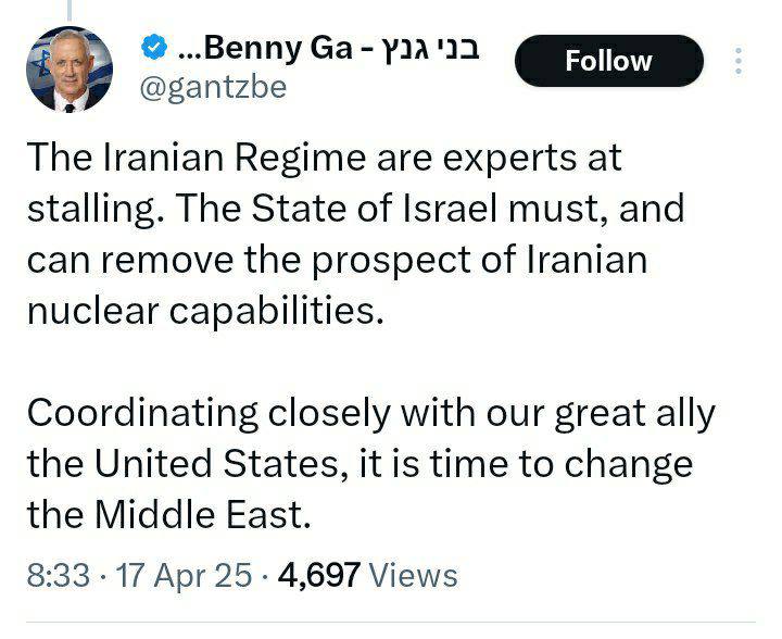 🔸️بنی گانتز، رئیس حزب وحدت ملی و از رهبران اپوزیسیون اسرائیل در حساب کاربری خود در ایکس نوشت: