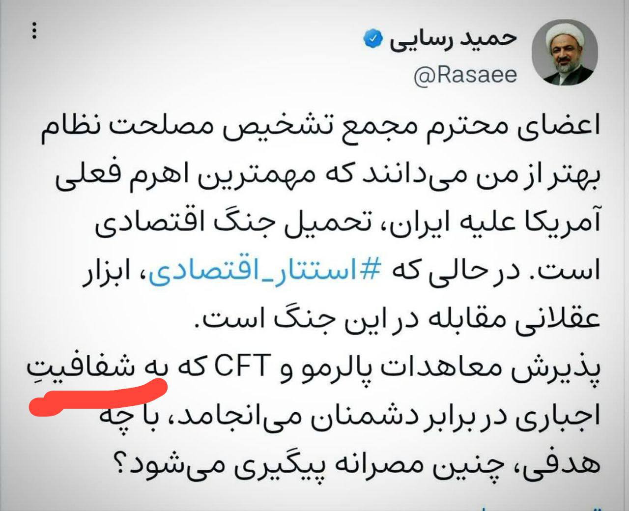 شیخ رسایی نماینده ۴ درصدی و تندرو مجلس رسما و علنا از مجمع تشخیص خواست به «شفافیت» اقتصاد ایران در عرصه بینالمللی تن ندهد! میخواهید با این جماعت، اقتصاد ایران جان و رونق بگیرد؟ اینها رسما میگویند ۲ ضربدر ۲ هر عددی میشود جز ۴، اینها اقتصاد به سبک مافیا میخواهند! در اقتصاد و سیاست داخلی هم دشمن شفافیتند والا به اینکه با ۴-۵ درصد رای وارد مجلس شدند پز نمیدادند! بلای جان این فرقه، «شفافیت» است!
