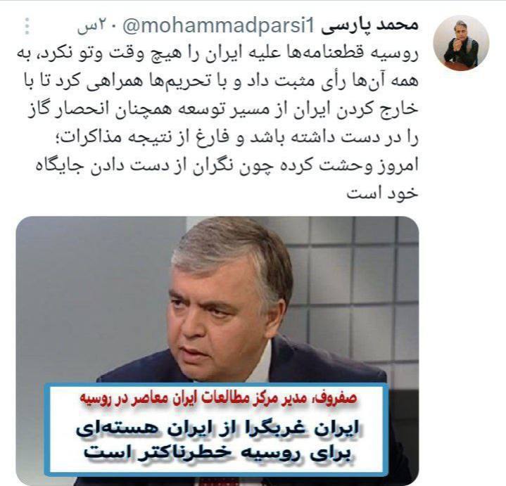 ✍️ محمد پارسی: روسیه قطعنامهها علیه ایران را هیچ وقت وتو نکرد به همه آنها رای مثبت داد و با تحریمها همراهی کرد تا با خارج کردن ایران از مسیر توسعه همچنان انحصار گاز را در دست داشته باشد، فارغ از نتیجه مذاکرات امروز وحشت کرده چون نگران از دست دادن جایگاه خود است