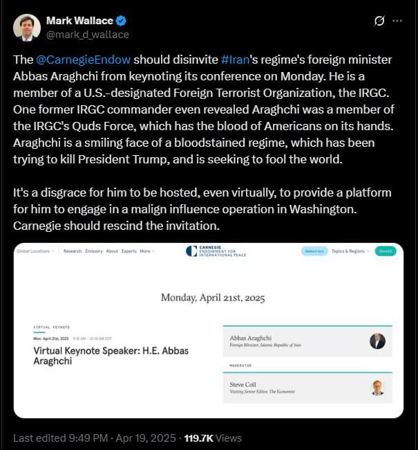 بنیاد کارنگی باید دعوت از عباس عراقچی، وزیر خارجه رژیم ایران، برای سخنرانی اصلی در کنفرانس روز دوشنبه را لغو کند. او عضو سپاه پاسداران انقلاب اسلامی است؛ سازمانی که از سوی ایالات متحده بهعنوان یک سازمان تروریستی خارجی شناخته شده است. یکی از فرماندهان سابق سپاه حتی فاش کرده که عراقچی عضو نیروی قدس سپاه بوده؛ نیرویی که دستانش به خون آمریکاییها آلوده است.