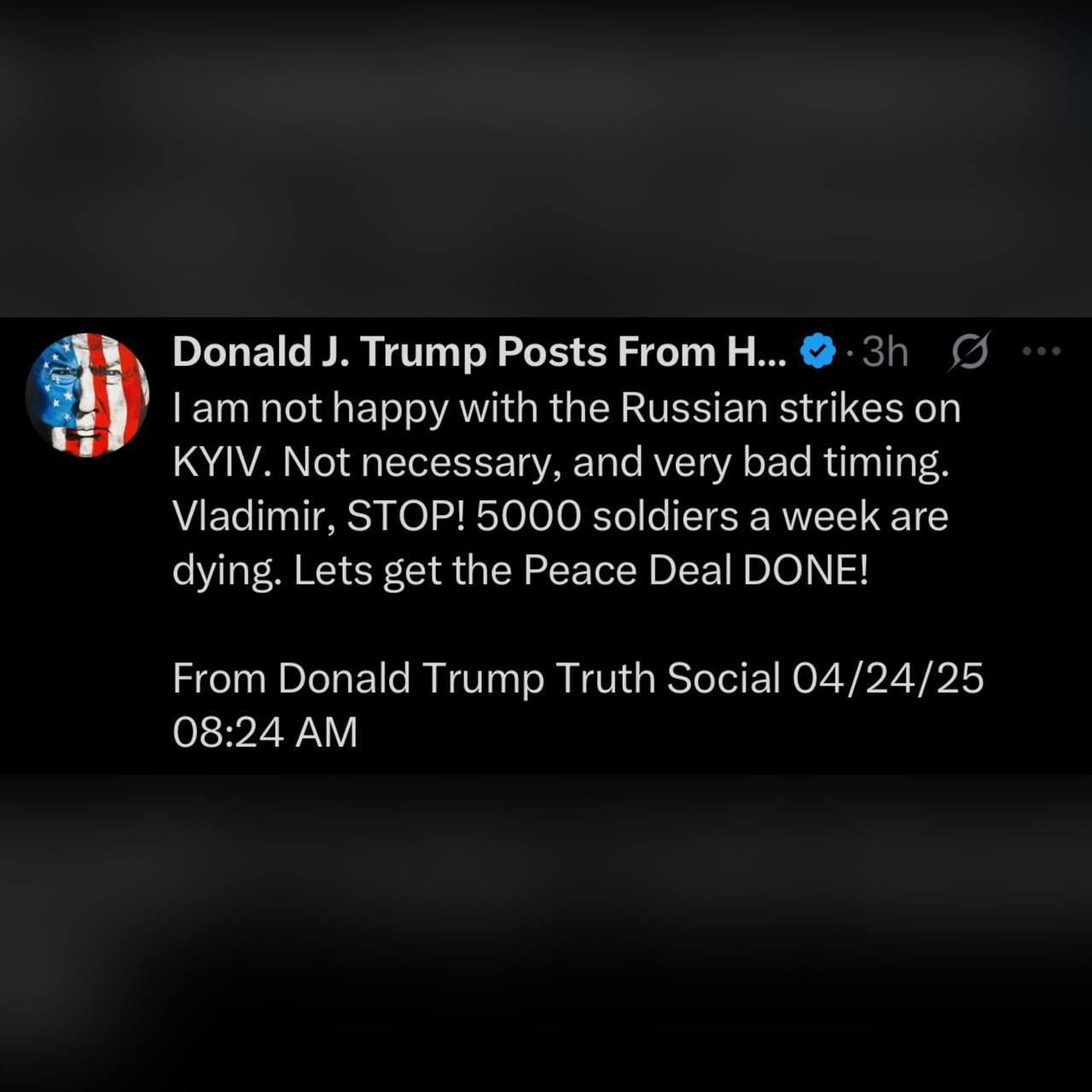 ترامپ در پیامی مستقیم به ولادیمیر پوتین، رئیسجمهور روسیه، خواستار توقف فوری حملات شد و گفت: «ولادیمیر، بس کن! هر هفته پنج هزار سرباز کشته میشوند. بیایید توافق صلح را امضا کنیم.»