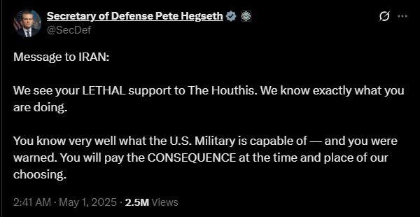 پت هگست وزیر دفاع آمریکا در پیامی هشدارآمیز خطاب به رژیم ایران اعلام کرد: