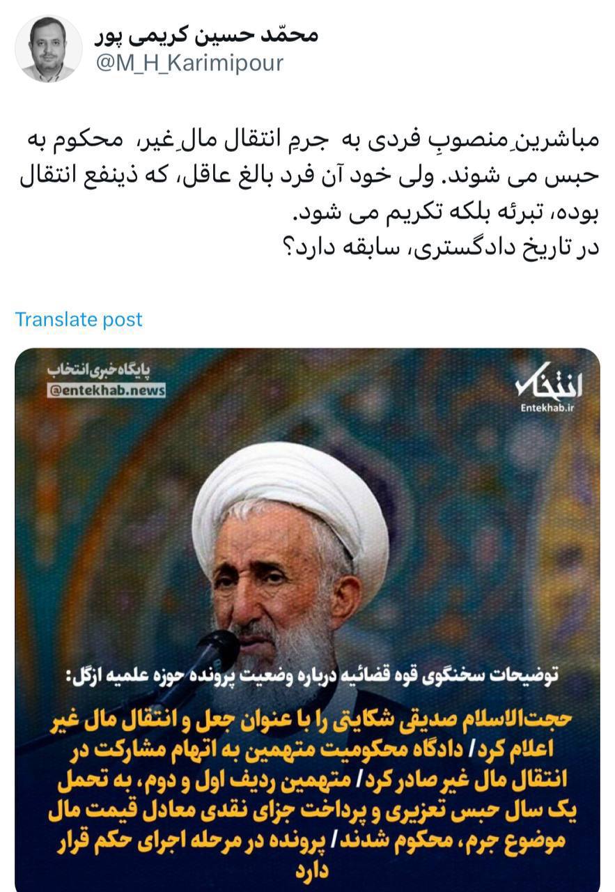 مباشرینِ منصوبِ فردی به جرمِ انتقال مالِ غیر، محکوم به حبس میشوند. ولی خود آن فرد بالغ عاقل، که ذینفع انتقال بوده، تبرئه بلکه تکریم میشود. دیدگاهتان را بنویسید لغو پاسخدیدگاهبرای ارسال دیدگاه نام یا نامکاربری خود را وارد کنید برای ارسال دیدگاه آدرس ایمیل خود را وارد کنید آدرس وبسایت خود را وارد کنید (اختیاری) ذخیره نام، ایمیل و وبسایت من در مرورگر برای زمانی که دوباره دیدگاهی مینویسم. Δ