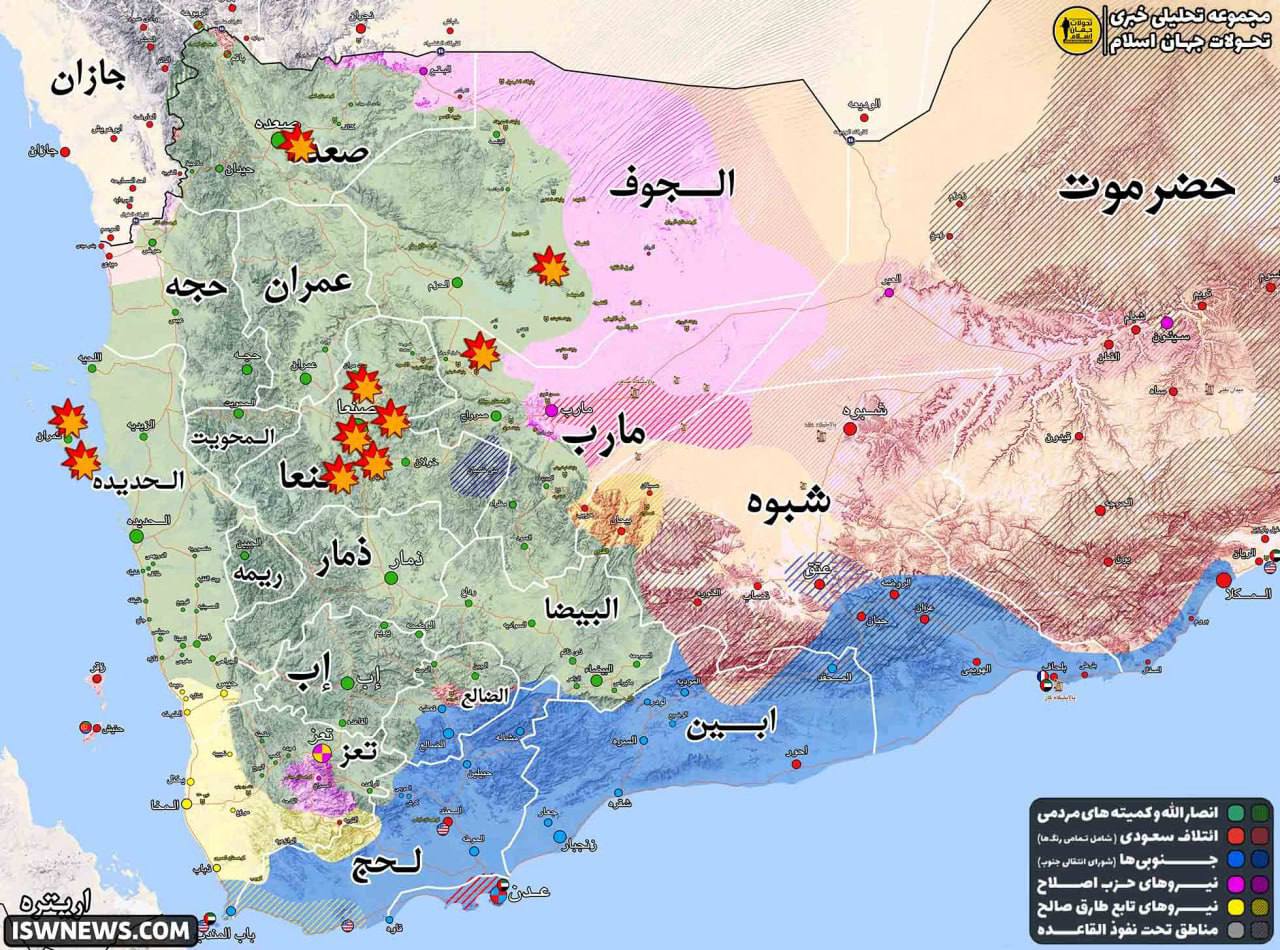 ▫️صنعا: سه حمله به منطقه السواد، شش حمله به مدیریت بنی مطر، یک حمله به منطقه الملکه در مدیریت بنی حشیش، دو حمله به منطقه سعوان در مدیریت شعوب، حمله به جاده اصلی منطقه الروضه در مدیریت بنی حارث، دو حمله به منطقه عطان.