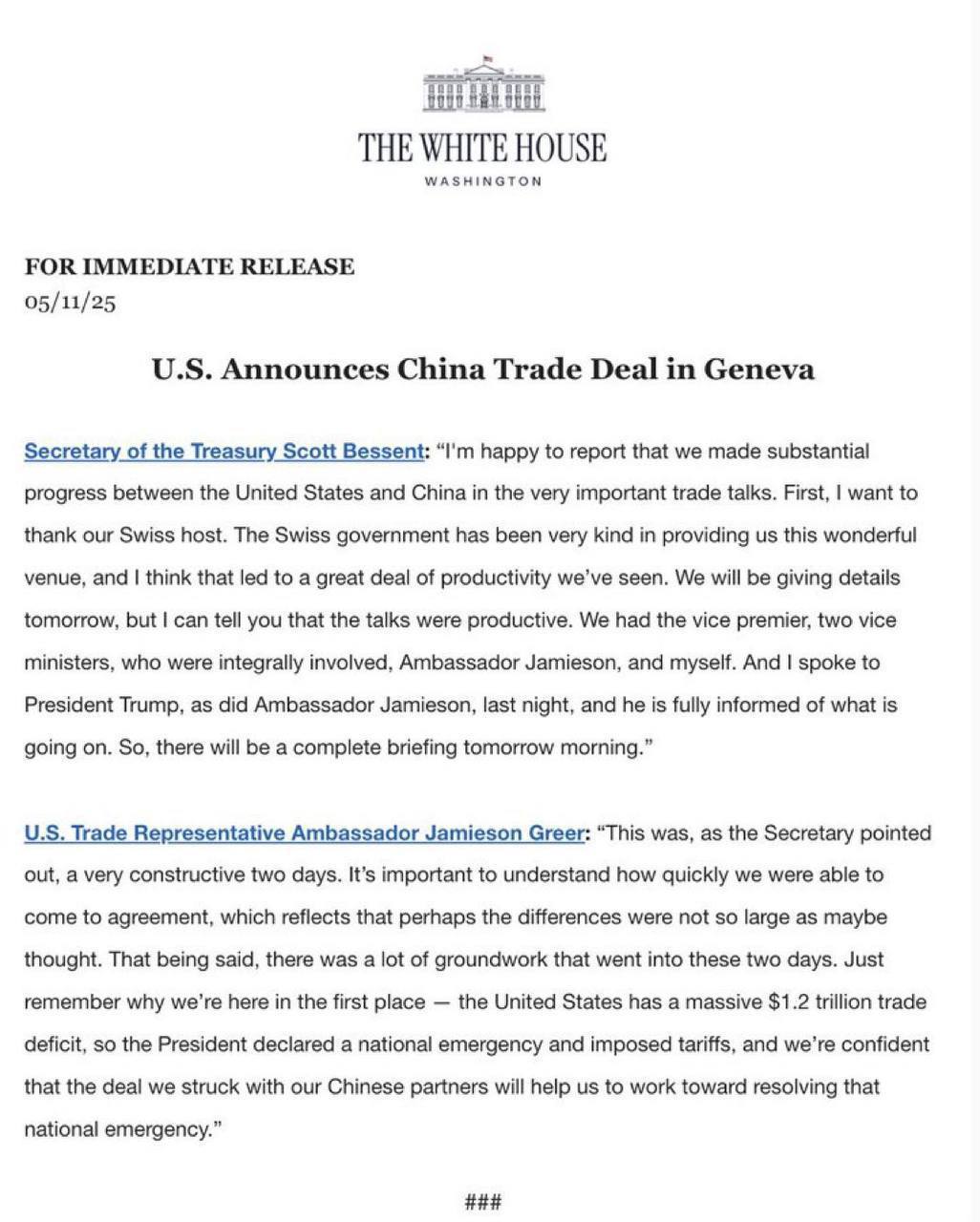اسکات بسنت، وزیر خزانهداری: «خوشحالم که گزارش دهم در مذاکرات تجاری بسیار مهم، پیشرفت قابل توجهی بین ایالات متحده و چین حاصل شده است. اول از همه، میخواهم از میزبان سوئیسیمان تشکر کنم. دولت سوئیس در فراهم کردن این مکان فوقالعاده برای ما بسیار لطف داشته است و فکر میکنم این امر منجر به بهرهوری زیادی شده است که شاهد آن بودهایم. ما فردا جزئیات را ارائه خواهیم داد، اما میتوانم به شما بگویم که مذاکرات سازنده بود. ما معاون نخستوزیر، دو معاون وزیر که کاملاً درگیر بودند، سفیر جیمیسون و خودم را داشتیم. و من دیشب با رئیسجمهور ترامپ صحبت کردم، همانطور که سفیر جیمیسون نیز صحبت کرد، و او کاملاً از آنچه در جریان است مطلع است. بنابراین، فردا صبح یک جلسه توجیهی کامل برگزار خواهد شد.»