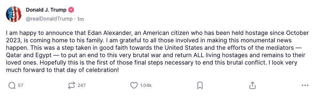 خوشحالم اعلام کنم که عیدان الکساندر، شهروند آمریکایی که از اکتبر ۲۰۲۳ گروگان گرفته شده بود، به خانه و پیش خانوادهاش بازمیگردد.