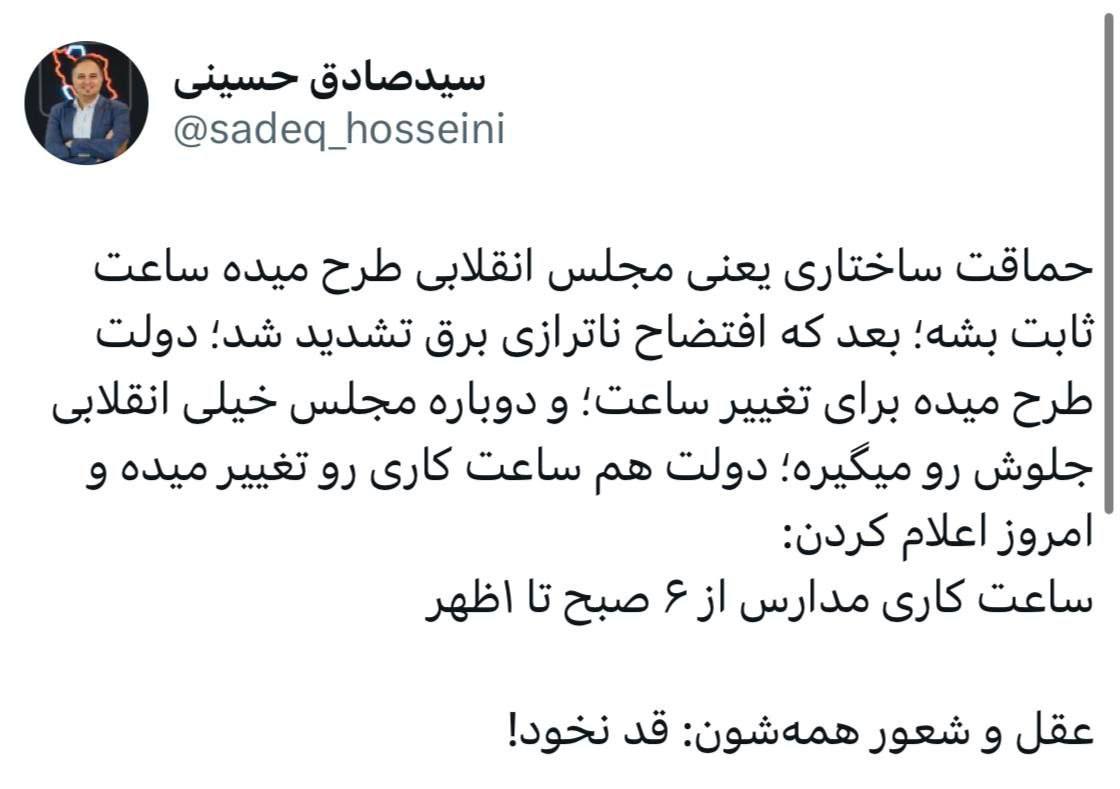 حماقت ساختاری یعنی مجلس انقلابی طرح میده ساعت ثابت بشه؛ بعد که افتضاح ناترازی برق تشدید شد؛ دولت طرح میده برای تغییر ساعت؛ و دوباره مجلس خیلی انقلابی جلوش رو میگیره؛ دولت هم ساعت کاری رو تغییر میده و امروز اعلام کردن: