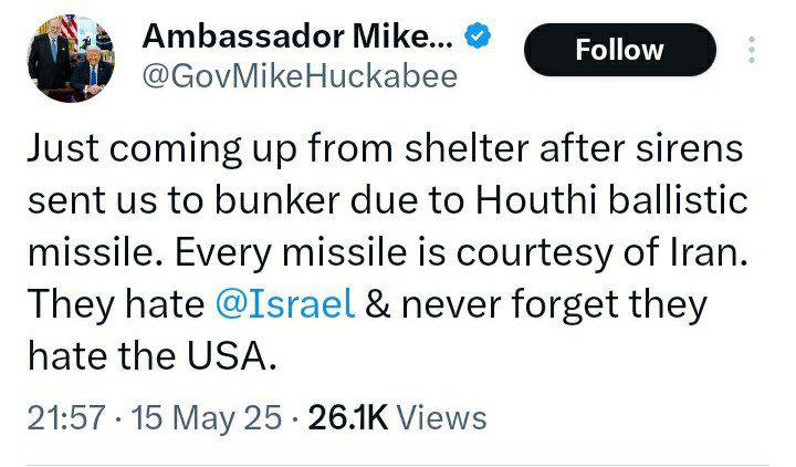 🔸️هر موشکی کار ایران است. آنها از اسرائیل متنفرند و هرگز فراموش نمی‌کنند که از آمریکا متنفرند.