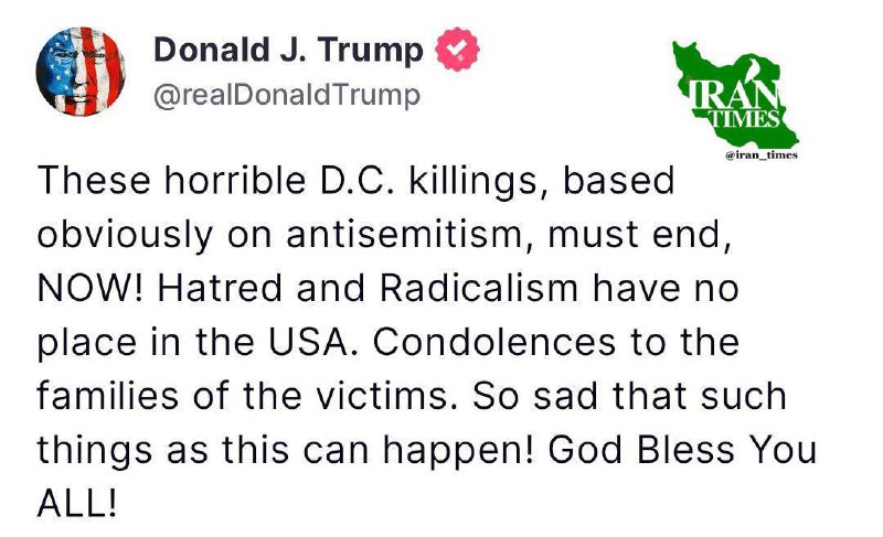 این قتلهای وحشتناک در واشنگتن دی سی، که آشکارا با انگیزه یهودستیزی انجام میشوند، باید فوراً متوقف شوند! در ایالات متحده جایی برای نفرت و رادیکالیسم وجود ندارد. به خانوادههای قربانیان تسلیت میگویم. وقوع چنین اتفاقاتی بسیار غمانگیز است! خدا همه شما را رحمت کند.