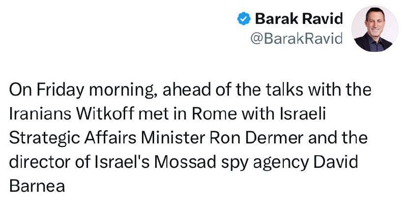 صبح جمعه، پیش از مذاکرات با ایرانیها، ویتکاف در رم با ران درمر، وزیر امور استراتژیک اسرائیل، و دیوید بارنی، مدیر سازمان جاسوسی موساد اسرائیل، دیدار کرد. دیدگاهتان را بنویسید لغو پاسخدیدگاهبرای ارسال دیدگاه نام یا نامکاربری خود را وارد کنید برای ارسال دیدگاه آدرس ایمیل خود را وارد کنید آدرس وبسایت خود را وارد کنید (اختیاری) ذخیره نام، ایمیل و وبسایت من در مرورگر برای زمانی که دوباره دیدگاهی مینویسم. Δ