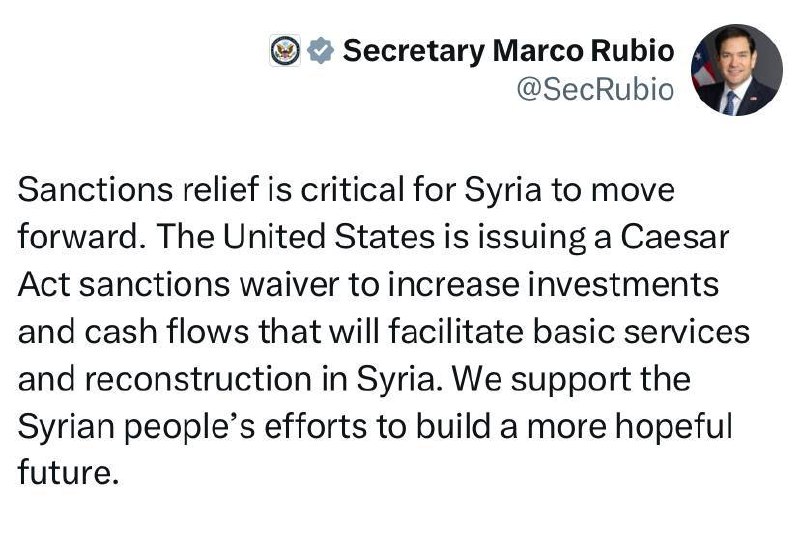 لغو تحریمها برای پیشرفت سوریه حیاتی است. ایالات متحده معافیت تحریمها را بر اساس قانون قیصر صادر میکند تا سرمایهگذاریها و جریانهای نقدی را افزایش دهد که خدمات اساسی و بازسازی در سوریه را تسهیل میکند. ما از تلاشهای مردم سوریه برای ساختن آیندهای امیدوارکنندهتر حمایت میکنیم.